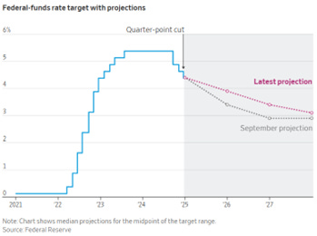 Trước Fed’s decision date vào giữa tháng Mười hai, thị trường cho rằng xác suất 25bps cut là khoảng 99% - con số này tăng dần so với mức ở khoảng 93% ở những ngày trước. Vàp lúc 14:25pm, ngày 18/12, Fed quyết định cắt 25bps, xuống còn 4.25%-4.5% đúng như thị trường kì vọng. Tuy nhiên, quyết định này không được đồng thuận: Ông Hammack Chủ tịch Fed tại Cleveland đề xuất là giữ nguyên FFR ở mức 4.5%-4.75%. Đáng chú ý hơn, median estimate của FFR của các thành viên FOMC tăng từ 3.4% lên 3.9%, tức là tăng 50bps. Có nghĩa là FOMC đang cho rằng có thể FFR vào cuối 2025 sẽ thấp hơn 50bps so với hiện tại (tương đương với hai lần rate cuts), so với 100bps trước đây (bốn lần rate cuts). Một trong các lý do là FOMC cho rằng tăng trưởng kinh tế (real GDP growth) kì vọng trong 2024 và 2025 đều gia tăng: lần lượt từ 2.0% lên 2.5% và từ 2.0% lên 2.1%.