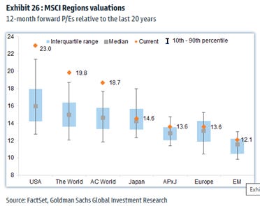 Do dòng tiền đổ vào US equities, tới giữa tháng Mười hai 2025, định giá forward PER tại thị trường này lên tới 23x, cao hơn hẳn so với phần còn lại của thế giới: EU (13.6x), EM (12.1x), APEC ex Japan (13.6x).
