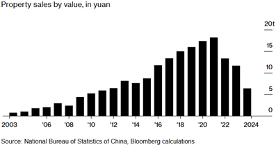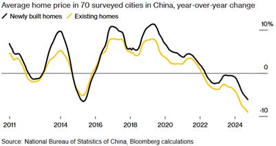Tuy thế, giá nhà vẫn tiếp tục có xu hướng giảm, thể hiện như chart ở dưới. Giá used houses giảm 39 tháng liên tục, thấp hơn 30% so với đỉnh tháng Bảy 2021. Fitch tiếp tục dự báo về một mức giảm giá nhà mới 5% trong 2025. Vì volume chỉ tăng nhẹ trong khi giá nhà vẫn giảm, nên doanh thu giao dịch nhà đất tiếp tục giảm xuống mức thấp mới.