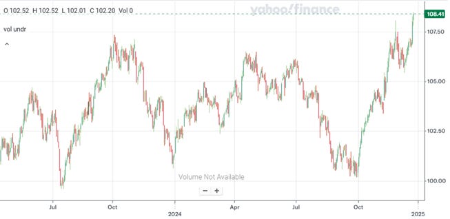 Điều này đã khiến chỉ số USDX tăng mạnh lên trên 108 điểm, còn cao hơn đỉnh tháng Tư 2024 và đỉnh tháng Mười 2023. Hiện tại chỉ số này chỉ còn thấp hơn mức đỉnh 115 thiết lập hồi cuối 2022 khi Fed có chu kì tăng lãi suất nhanh.