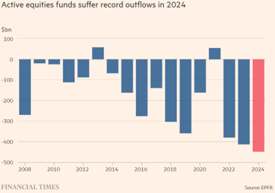 Trong khi đó, các active equities funds lại bị rút tiền kỉ lục, lên tới $450bn, trong năm 2024, để đổ sang passive. Các nhà đầu tư đã rót $1.6tn vào các quỹ ETFs trong 2024, nâng tổng AUM của ngành này tăng 30% lên $15tn.