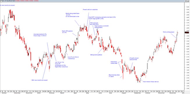 Các diễn biến và dữ liệu này khiến yield phi lên ầm ầm. Từ dưới 4.4%, 10yr yield tăng vọt lên qua 4.5%. Tới ngày 20/12, 10yr yield đã phi vọt lên mức 4.59% trước khi chỉnh về 4.52%. Như vậy, trong vòng hai tuần, 10yr yield đã tăng tới 37.3 bps, mức tăng cao nhất trong hai tuần kể từ tháng Mười hai 2022, khi Fed có đà tăng vô tiền khoáng hậu.