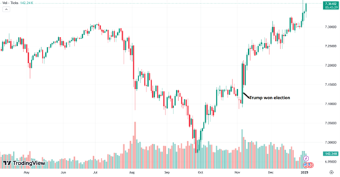 Thị trường tài chính phản ứng mạnh với các tài sản Trung Quốc sau khi tổng thống Trump tái cử. Ngày bầu cử 6/11, cặp tiền USDCNH offshore tăng vọt từ 7.1 lên 7.21, và tăng từ đó lên quanh mức 7.3. Trước đây PBoC có xu hướng can thiệp (thông qua các ngân hàng thương mại) mỗi khi tỉ giá lên gần đến mức tâm lý 7.3. Vào cuối tháng Mười hai, có nhiều lần tỉ giá vượt qua mức này. Cặp tiền này chịu áp lực một phần vì trong thời gian gần đây, lãi suất tại Trung Quốc giảm mạnh. Tỉ giá onshore cũng vượt lên mức 7.3 lần đầu tiên kể từ tháng Mười một 2023.
