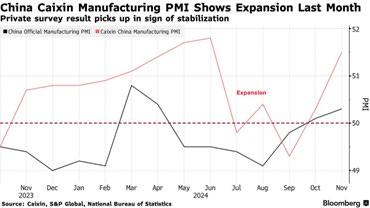 Với triển vọng của tariff 2.0 khi Trump tái cử, thông tin rằng các retailers tại Mỹ đang tấp cập frontloading. Do đó, PMI của Trung Quốc tăng trưởng tốt trong hai tháng trở lại đây. Cả dữ liệu PMI chính thức, vốn có weight nặng hơn bởi các công ty quốc doanh, và PMI Caixin, có tỷ trọng private cao hơn, đều mở rộng trong hai tháng liên tục.