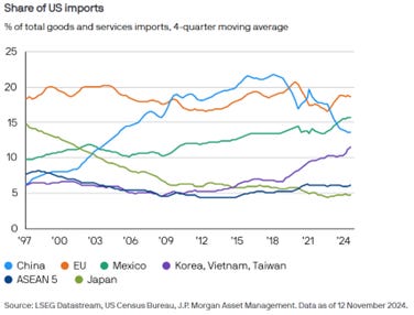 Nhóm các nước mà từ đó nước Mỹ nhập khẩu lớn được thể hiện trong đồ thị. Decoupling đang thực sự diễn ra, tỉ trọng nhập khẩu từ Trung Quốc giảm sút từ khoảng 22% trước chính quyền Trump xuống còn khoảng 13% hiện tại. Một phần các công ty sản xuất của Trung Quốc đã friendshore (Vietnam), nearshore (MXN) hoặc đơn giản là các quốc gia khác như Hàn Quốc đã chiếm được thêm thị phần.