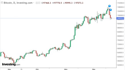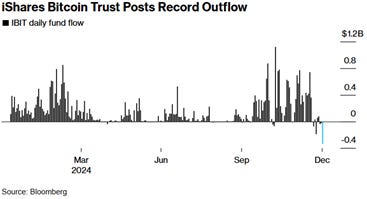 Như vậy, FOMC đưa ra một thông điệp bước ngoặt trên thị trường. Khi lãi suất hóa ra lại sẽ mức cao hơn so với thị trường dự tính, thị trường phải priced lại các asset classes. Tâm lý risk-off lan rộng. Dòng tiền đã rút ra khỏi các quỹ crypto ETFs. Ngày 24/12, dòng tiền rút ra xấp xỉ $190mn. Điều này khiến giá crypto rơi rất mạnh. BTC giảm từ mức khoảng 108k xuống còn 97k.