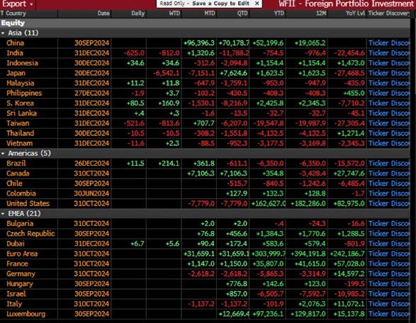 Tính hết năm 2024, tình hình inflow/outflow với thị trường equities trên thế giới như sau (in USD millions, màu xanh là inflow và màu đỏ là outflow):