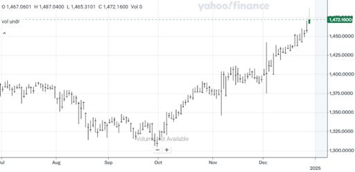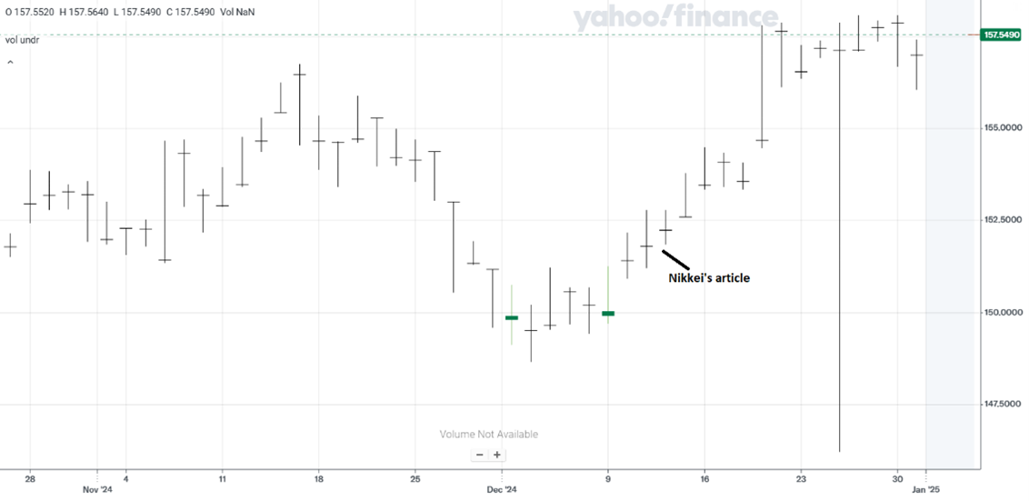 Ngày 12/12, Nikkei dự đoán rằng BOJ sẽ không tăng lãi suất trong cuộc họp cuối cùng trong năm, mà có thể lùi sang tháng Một tới. 10yr yield giật qua lại trên mức 1.05%. Thấy vậy, đồng JPY lập tức yếu đi, cặp tiền USDJPY tăng đều đặn từ khoảng 152 trước thông tin này, lên mức 154, rồi 155, 157, và xấp xỉ 158 khi kết thúc năm 2024.