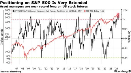 Một điều đáng chú ý là các equities investors dường như đã bỏ qua ý định đầu tư ra ngoài Mỹ. Điều này được kích thích bởi exceptionalism của Mỹ: nền kinh tế tăng trưởng mạnh mẽ trong thời gian dài, bỏ qua các đối thủ như EU, Japan. Châu Âu và Nhật không có tech sector mạnh mẽ như Mỹ, và khu vực/quốc gia này đều gặp một vấn đề khác nhau. Đối thủ đang lên của nó là Trung Quốc đang tăng trưởng chậm lại – một số ý kiến e ngại rằng nó có thể sa vào một giai đoạn trì trệ dài giống như Nhật trong những năm 1990s. Lượng S&P500 futures contract mà các traders đang net long ở mức kỉ lục từ trước tới nay. Điều này đồng hành với các mức cao mới của thị trường (xem chart ở dưới.) Điều này có nghĩa là khi thị trường càng đắt đỏ hơn, volume long cổ phiếu càng nhiều hơn.