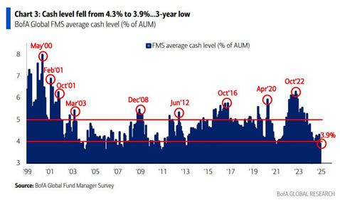 Khi lượng cổ phiếu nắm giữ nhiều hơn, lượng tiền mặt của các fund managers xuống một trong những mức thấp so với lịch sử. Điều này không hàm ý rằng thị trường cổ phiếu sẽ phải giảm giá ngay lập tức, nhưng, nó có nghĩa rằng nhiên liệu cho đà tăng giá sẽ giảm bớt.