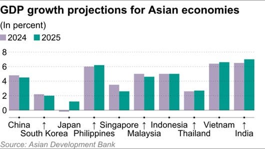 Theo dự báo của tổ chức này, tăng trưởng kinh tế tại một số nước trong 2025 tiếp tục bứt tốc so với năm ngoái, trong đó đứng đầu sẽ là India, Vietnam, Philippines, Indonesia, Thailand và Nhật bản. Một số nước khác có tăng trưởng giảm xuống, nổi bật nhất là Trung Quốc, South Korea, Singapore.