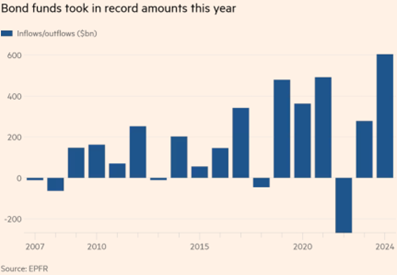 Tuy vậy, do các CBs chủ yếu đều trong chu kỳ giảm lãi suất, dẫn đến bond tăng giá. Các nhà đầu tư chạy theo chiều hướng này và đổ tiền vào các global bond funds. Mức inflow vào các global bond funds lên tới trên $600bn, cao hơn hẳn mức cao nhất là xấp xỉ $500bn trong năm 2021.
