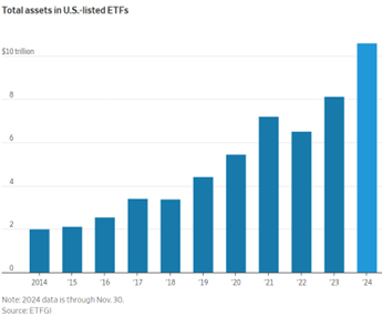 Dòng tiền cũng đổ vào các US-listed equities ETFs, khiến assets trong các ETFs này vào cuối 2024 tăng hơn 30% so với năm ngoái, đạt tới hơn $10.6tn. Tổng cộng trong 2024 các nhà đầu tư rót thêm hơn $1tn vào các quỹ này, trong đó riêng tháng Mười Một, khi Trump được tái đắc cử là $164bn, khiến mức inflow vào US equities chiếm đến 97% inflow toàn thế giới trong tháng.