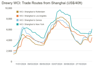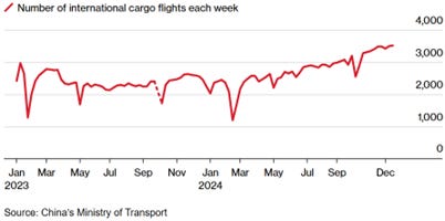Lượng container throughput tại Trung Quốc tăng 30% trong tuần thứ hai của tháng Mười Hai (không rõ YoY hay MoM). Ông CEO Mario Cordero của cảng Long Beach nhận định rằng lượng hàng nhập khẩu tại Mỹ có thể tăng đến mùa xuân năm 2025.