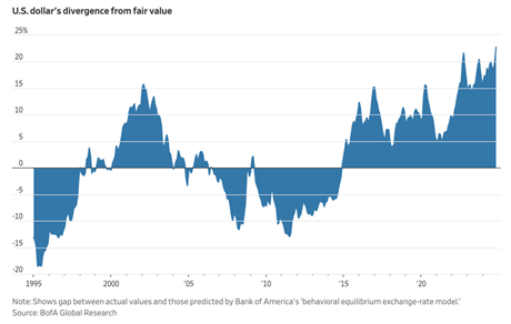 Theo một model của BofA, gọi là “behavorial equilibrium FX rate model” thì đồng USD đang đắt hơn fair value nhiều nhất trong lịch sử.