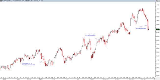 Thị trường cổ phiếu bị bán tháo ác liệt. DJIA, vốn dĩ ở trong đà giảm 10 phiên liên tục, chưa có tiền lệ kể trong vòng 50 năm, giảm 1120 điểm. Đà giảm của DJIA liên tục trong thời gian này được kích thích bởi vụ sát hại CEO của công ty UnitedHealth, vốn là công ty có price lớn nhất trong cái price-weighted index này, của một anh tên là Luigi – tên sát nhân này lại được nhiều người thông cảm vì họ cũng gặp chuyện với các công ty bảo hiểm.