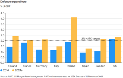Một trong những áp lực của các nước EU từ Trump 2.0 là chi tiêu cho quân sự, với mức mục tiêu là 2% GDP. Nhìn chung các nước đều đã tăng mức chi tiêu quân sự lên trên mức mục tiêu 2%. Nước outlier nhất là Poland, với mức chi tiêu vượt trội trên 4%. Các nước Italy, Spain có mức chi tiêu thấp hơn nhiều, dù đã gia tăng chi tiêu kể từ cuộc khủng hoảng Euro bond crisis, mà chính các nước này chịu áp lực mạnh nhất. (xem đồ thị ở dưới.)