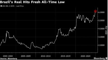 Ngày 17/12, Ngân hàng Trung ương Brazil phải bán USD để hỗ trợ tỉ giá. Hiện tại, tỉ giá đồng real của nước này giảm quá 6, mức all-time-low.