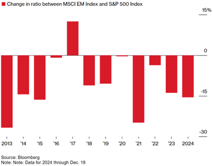 Năm 2024 tiếp tục là một năm thảm họa cho các fund managers đầu tư vào EMs. Chỉ số MSCI EM Index đã underperformed so với S&P500 mười một năm trong suốt mười hai năm gần nhất (từ 2013, xem chart ở dưới). Trong thời gian này, S&P500 cho 430% return, gấp mười lần so với mức của EMs. Trong quá khứ, EMs đã từng outperformed US: thập kỉ 2000-2010, EMs equities cho returns 359% so với chỉ 31% của US.