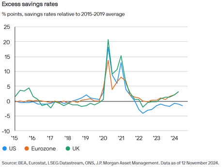 Người tiêu dùng tại phương Tây đã tiêu hết khoản saving họ có được từ COVID. Có thể do triển vọng kinh tế khó khăn, các nước EU và UK thận trọng trong chi tiêu và thay vào đó tiết kiệm nhiều hơn, thể hiện trên đồ thị.