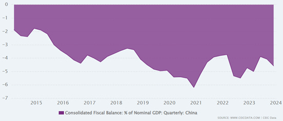 (chart: thâm hụt ngân sách so với GDP của Trung Quốc 2013-2024, CEIC)