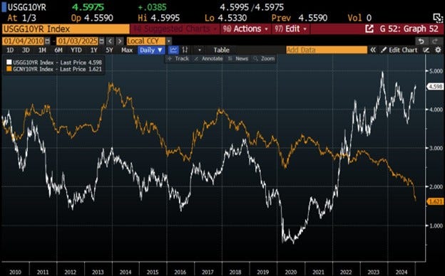 Vào tuần đầu tiên 2025, lợi suất trái phiếu 10yr Trung Quốc đã rơi xuống 1.6%, khiến chênh lệch lợi suất giữa Mỹ và Trung Quốc lên mức cao nhất trong lịch sử.